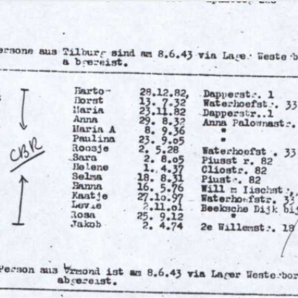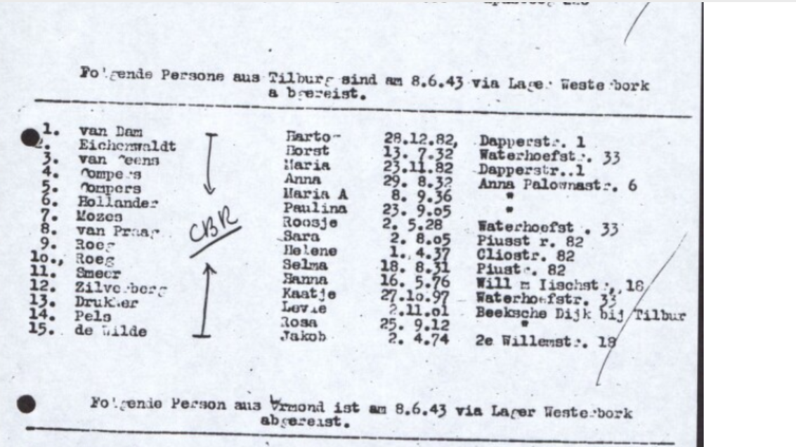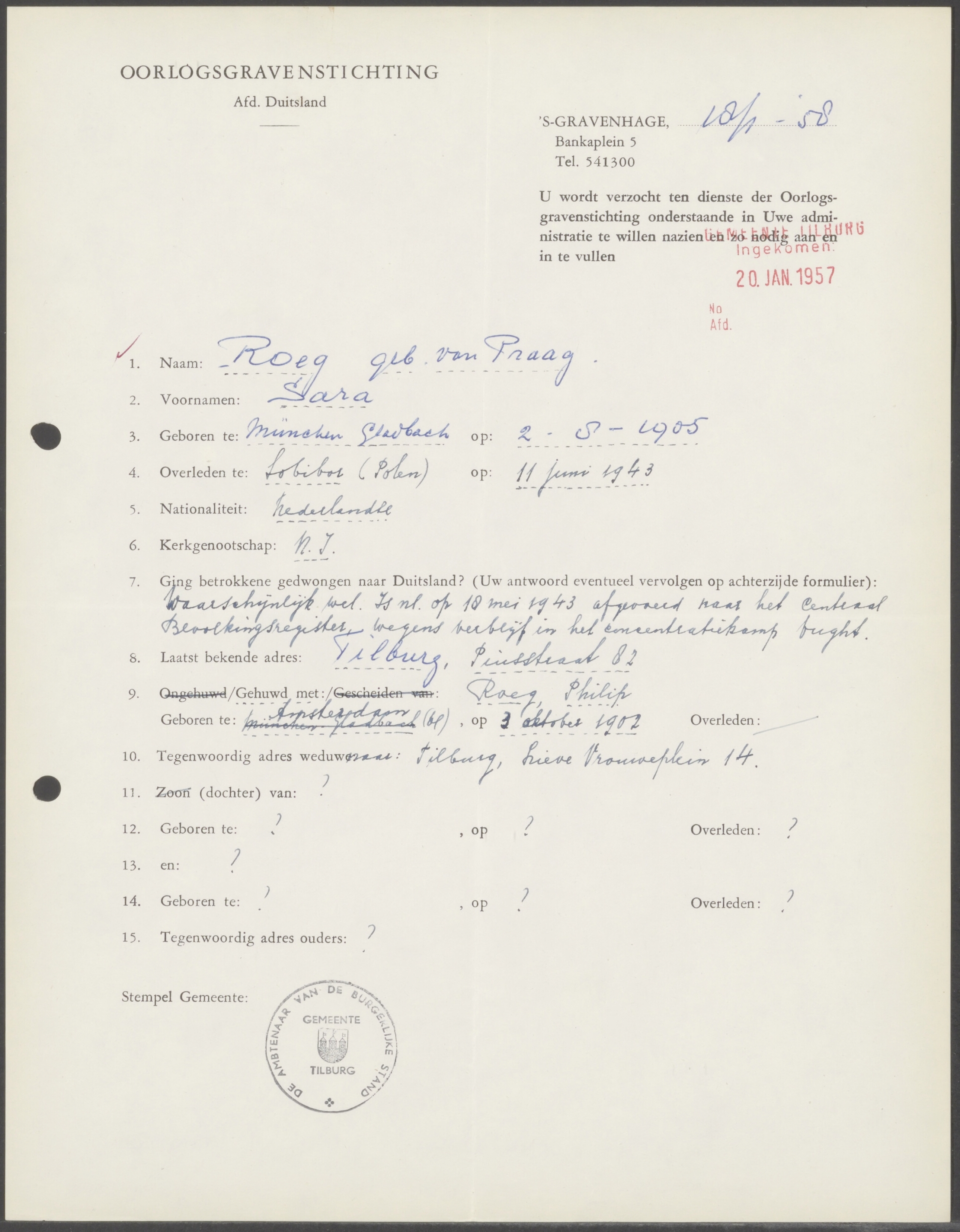 Sara van Praag (1905) is geboren in Mönchen-Gladbach (*) en getrouwd met Philip Roeg. Ze is de moeder van Selma-Adele Roeg (1931) en Helene Roeg (1937) (* foto van geni.com of myheritage). Haar man, Philip Roeg, werkte bij de vader van Sara als verkoper (*). In 1938 is het hele gezin verhuisd naar Tilburg, om de dreiging van nazi-Duitsland te ontvluchten (*), waar ze gingen wonen in de Piusstraat 82 (*).