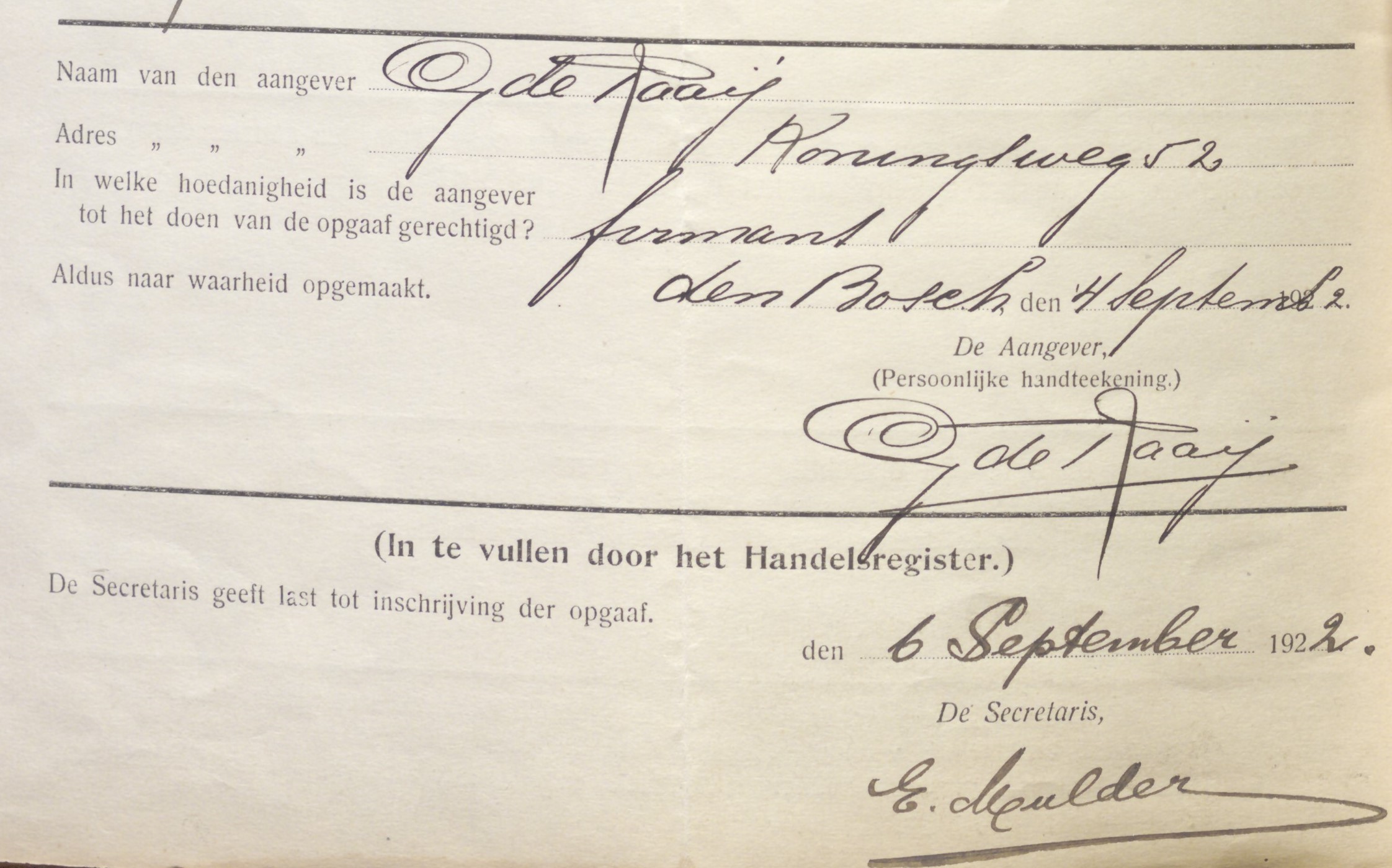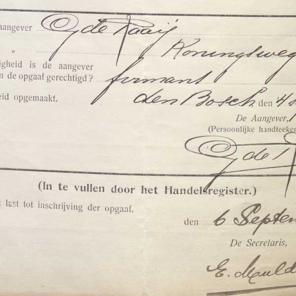 BHIC, Arrondissementsrechtbank ‘s-Hertogenbosch 1950-1959, inv. nr. 577: '1. 1942, 11 maart. Godschalk, zich ook noemende Gerrit de Raaij, koopman, te 's-Hertogenbosch, Koningsweg 52. Griffierechten f. 30,- Overgebracht naar register van Griffierechten, den 4 Aug. 1943.’ De folder met informatie over het faillissement ontbreekt in het dossier Arrondissementsrechtbank ‘s-Hertogenbosch 1940-1949, inv. nr. 000379. Met dank aan Lisette Kuijper van het BHIC.