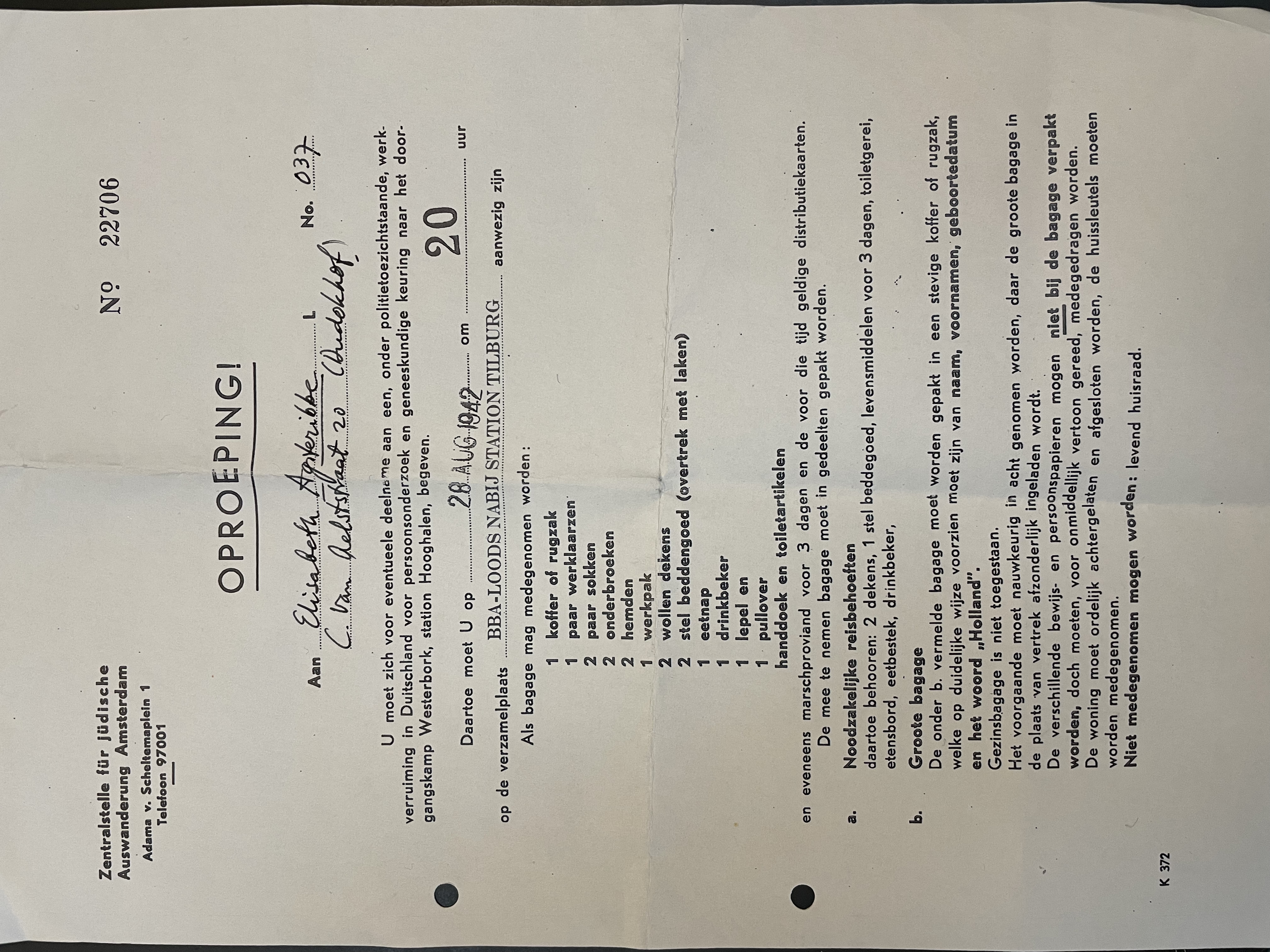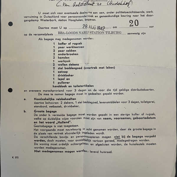 - een reconstructie van de brief waarin Elisabeth werd opgeroepen zich op 28 aug. 1942 te melden bij het station in Tilburg, waar haar reis naar Auschwitz begon.