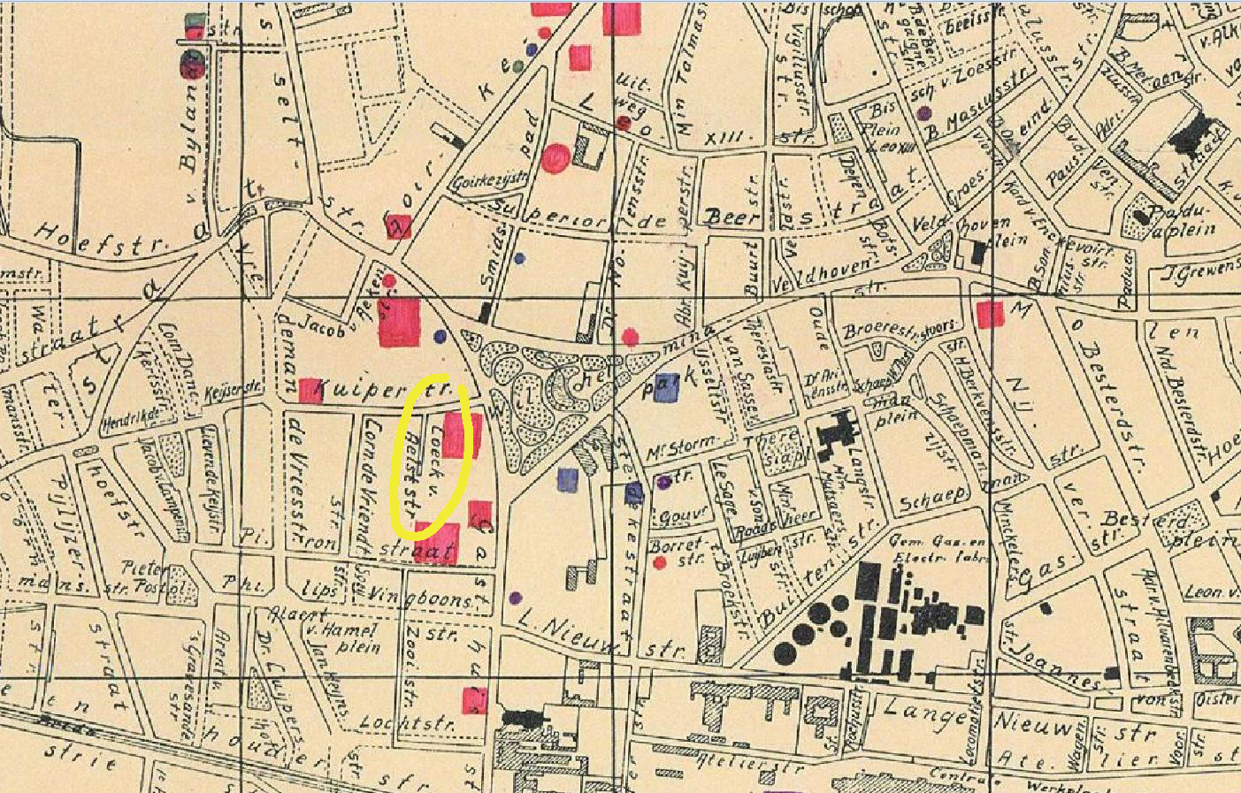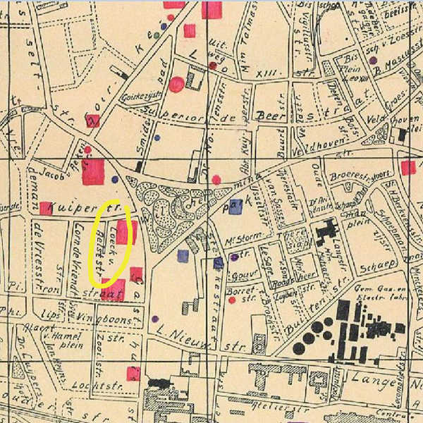 - detail kaart van Tilburg uit de jaren dertig, waarop de Coeck van Aelststraat nog te zien is