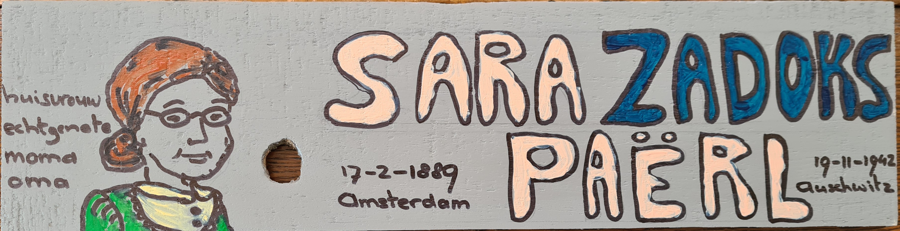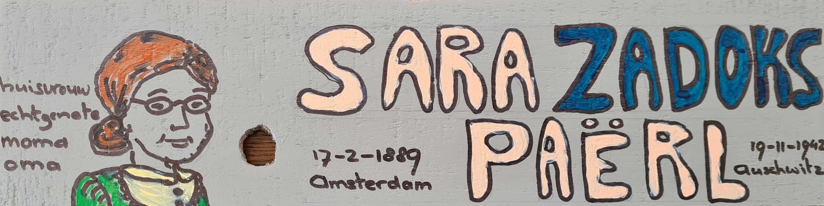 Sara is de vrouw van Henri Zadoks, ze hadden een drogisterij in de Voorstraat nummer 128. Nu is dat nummer 164. Ze kregen samen drie kinderen: een dochter Jenny Dasberg-Zadoks, die getrouwd is en in Rotterdam is gaan wonen, zij en haar man Maurits Dasberg kregen een zoontje Henri Samuel. Ook kregen Henri en Sara twee zonen Barend en Philip Izak. Zij waren nog niet getrouwd toen ze werden opgepakt. Sara is een tijd secretaresse geweest van de Vrouwenvereniging Praktisch Palestinawerk.