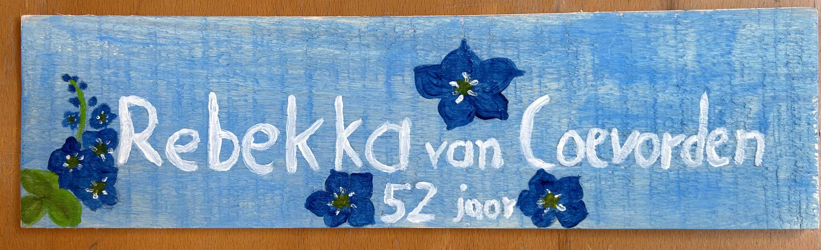 Ik heb voor Rebekka vergeet-mij-nietjes geschilderd. Rebekka was 52 jaar, even oud als ik nu, toen ze werd vermoordt.