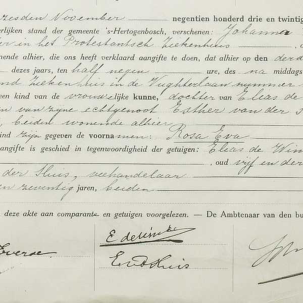 Rosa Eva werd geboren in het Protestants Ziekenhuis in Den Bosch. Het jaar ervóór was haar moeder nog thuis in hun woning aan de Kruisstraat 15 bevallen van een zoontje, Isidor Elias, maar in het geval van Rosa Eva werd misschien gevreesd dat het een moeilijke bevalling zou kunnen zijn. Vader Elias doet drie dagen later aangifte samen met zijn schoonvader Elias van der Sluis. Rosa Eva zijn haar voornamen voor de burgerlijke stand, maar in het geboorteregister van de joodse gemeente staat ze ingeschreven als: Roosje (zonder een Hebreeuwse naam in de marge, wat gebruikelijk was).