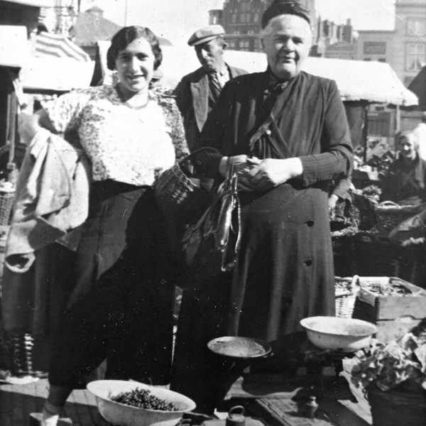 Van Rosa Eva’s oma Sara is nog een mooie foto, rond 1930 op de Bossche markt genomen. Sara draagt een zwart hoedje en heeft een boodschappentas en een rieten mandje om de rechterpols. Ze heeft haar handen in elkaar geslagen en kijkt vriendelijk in de lens. De foto is genomen van achter een fruitstalletje, waarschijnlijk in de zomer. De vrouw naast haar lacht tegen de fotograaf en heeft een regenjas om de arm geslagen. Zou het Rosa Eva’s moeder Esther kunnen zijn? Esther had twee zussen, een ervan woonde in Herwijnen, de ander in Amsterdam. De twee staan dicht genoeg bij elkaar om geen toevallige bekenden te zijn. Als dat zo is, dan zijn drie generaties in deze twee foto’s te zien.