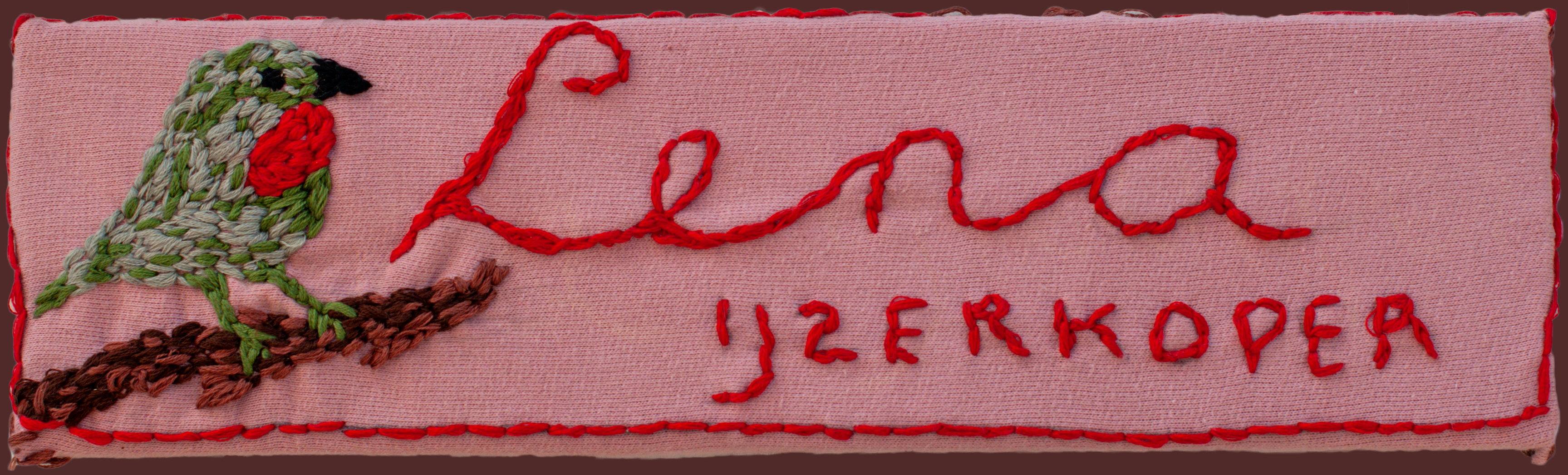 Voor Lena, die werkte als naaister heb ik een kleine vogel geborduurd. Net als Lena woon ik ook in de Veeteeltstraat, een paar huizen verderop. In Betondorp staan (anders dan de naam doet vermoeden) mooie bomen en zie ik veel vogels. Bij het ontwaken hoor ik vaak een merel zingen. Misschien hoorde Lena dat ook toen ze hier woonde, zo'n mooi en troostend wijsje.
