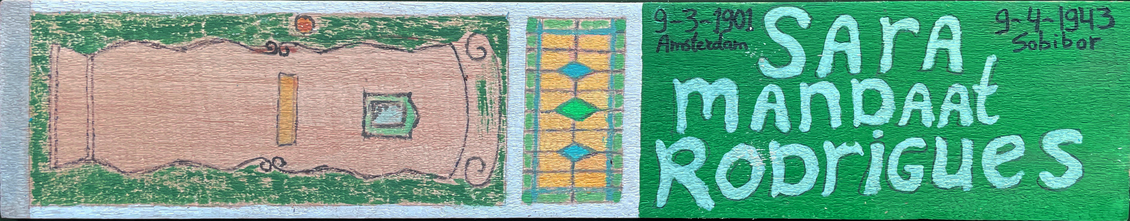 Op de linkerhelft van het naambordje voor Sara is de voordeur van haar huis aan de Molenbochtstraat geschilderd. Ik woon daar zelf vlakbij.